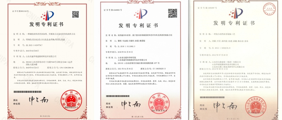 公司研制的MAC改性瀝青獲得了《一種凝膠改性瀝青添加劑、其制備方法及對(duì)瀝青的改性方法》和《高性能冷補(bǔ)瀝青、基于廢舊瀝青路面材料的冷補(bǔ)料及兩者的制備方法》等發(fā)明專利授權(quán)。MAC改性瀝青大碎石柔性基層新型路面結(jié)構(gòu)獲得實(shí)用新型專利證書(shū)。