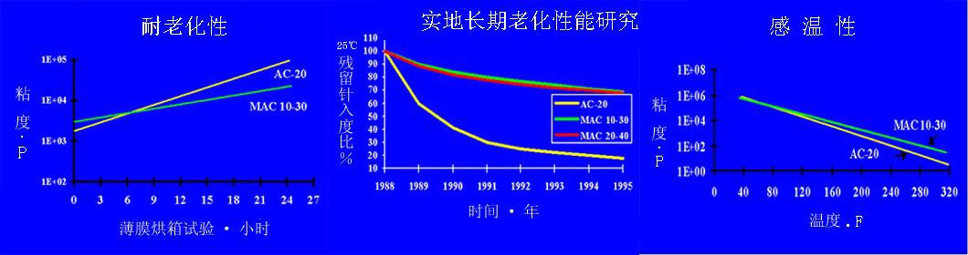 MAC??改性瀝青具有較強(qiáng)的抗老化能力。通過薄膜烘箱加熱老化時(shí)間與瀝青粘度變化的關(guān)系曲線可以發(fā)現(xiàn),隨著加熱時(shí)間的增加,MAC??改性瀝青的粘度增長(zhǎng)明顯低于基質(zhì)瀝青,說明抗老化性能強(qiáng)。通過對(duì)實(shí)地長(zhǎng)期老化性能研究,可以清楚發(fā)現(xiàn),基質(zhì)瀝青在幾年的時(shí)間內(nèi)殘留針入度比急劇降低,而MAC??改性瀝青的殘留針入度比只是隨時(shí)間緩慢地降低,說明MAC??改性瀝青具有優(yōu)良的抗長(zhǎng)期老化的能力。