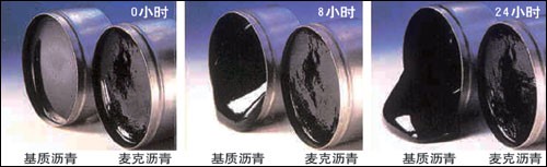 MAC??改性劑在瀝青中通過化學(xué)反應(yīng)生成大量極性物質(zhì)并產(chǎn)生聚集,形成網(wǎng)狀格架結(jié)構(gòu),使瀝青的內(nèi)聚力大大增強(qiáng),可生產(chǎn)出高粘度改性瀝青。同時(shí)由于瀝青極性的加強(qiáng),使瀝青與集料表面的粘附性增強(qiáng)。基于上述兩種原因,瀝青與集料膠結(jié)體系的膠結(jié)強(qiáng)度也隨之大大提高。MAC??改性瀝青呈凝膠狀,這種凝膠結(jié)構(gòu)使瀝青不會(huì)輕易移動(dòng),且其品質(zhì)穩(wěn)定,不會(huì)產(chǎn)生離析。室溫下,基質(zhì)瀝青或其他改性瀝青隨時(shí)間流逝而流動(dòng),而MAC??改性瀝青不隨時(shí)間而流動(dòng)。