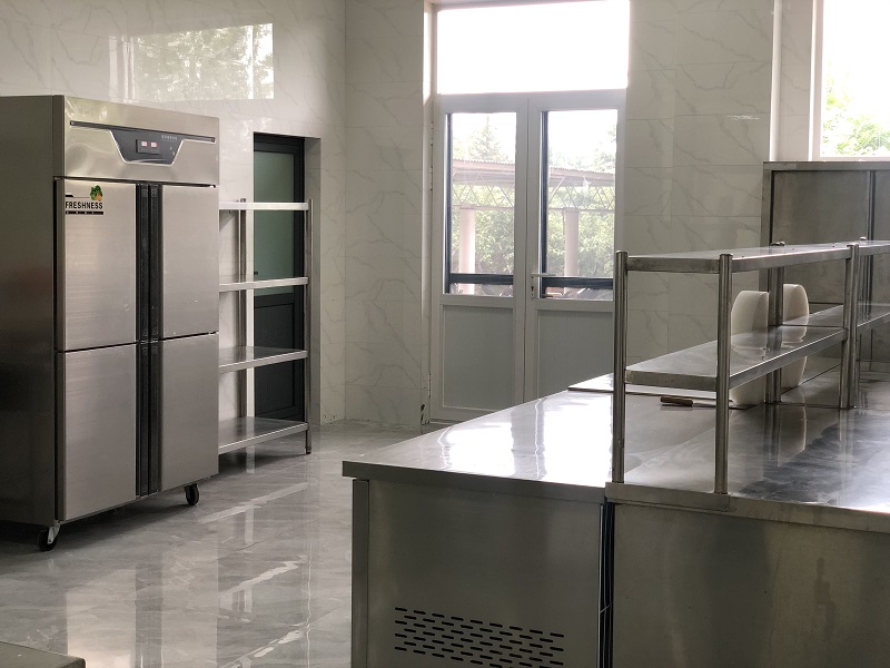 廚房全部新鋪設了地板磚和墻面磚,更換了部分門窗、環(huán)保排煙罩,并對部分老舊廚具和炊具進行了重新購置。餐廳墻面全部粉刷乳膠漆,整潔一新。
