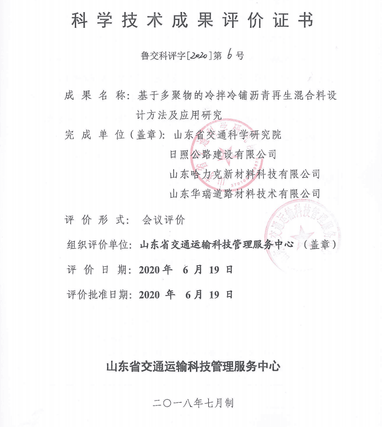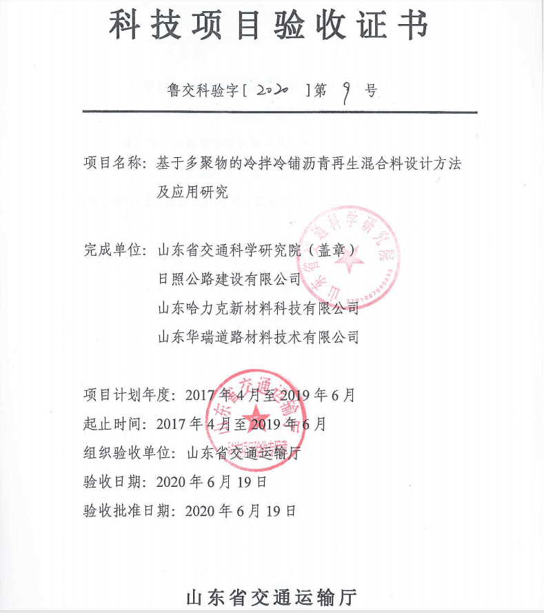 6月19日,我公司參加的“基于多聚物的冷拌冷鋪瀝青再生混合料設(shè)計方法及應(yīng)用研究”課題,順利通過了山東省交通運(yùn)輸廳組織的成果驗收和評價工作。