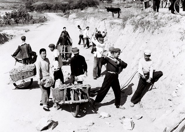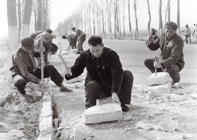 那時候修路就是“四大件”:鐵锨、大鎬、石夯、小推車,修路全靠掄大鎬、鐵锨,肩扛人抬小車推。