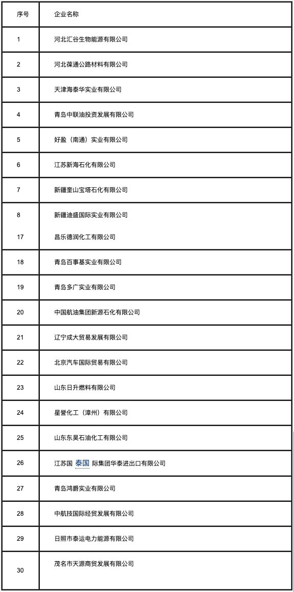 根據(jù)商務(wù)部2012年第66號公告《公布2013年燃料油非國營貿(mào)易進(jìn)口允許量申領(lǐng)程序、分配原則》(以下簡稱《公告》)的要求,中國五礦化工進(jìn)出口商會對新申請2013年第二批燃料油非國營貿(mào)易進(jìn)口企業(yè)報送的材料進(jìn)行審核,商務(wù)部外貿(mào)司對審核情況進(jìn)行了復(fù)審。截止2013年3月31日,共有41家企業(yè)報送了申請材料,其中符合《公告》要求的有30家企業(yè),現(xiàn)將材料齊全企業(yè)名單進(jìn)行公示,公示期為2013年4月19-25日。公示期間,對公示名單有異議的,可向商務(wù)部(外貿(mào)司)提請公示復(fù)核。同時公布材料不齊全企業(yè)名單及所缺材料,公示期間,各相關(guān)企業(yè)仍可將補充材料報送至商務(wù)部外貿(mào)司,同時抄送中國五礦化工進(jìn)出口商會。