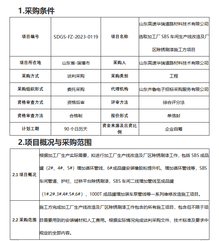 山東高速華瑞道路材料技術(shù)有限公司選取加工廠SBS車(chē)間生產(chǎn)線改造及廠區(qū)除銹刷漆施工方項(xiàng)目談判采購(gòu)公告