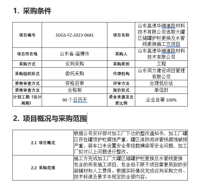 山東高速華瑞道路材料技術(shù)有限公司選取大罐區(qū)儲(chǔ)罐護(hù)欄更換及水管線更換施工方項(xiàng)目項(xiàng)目采購(gòu)公告